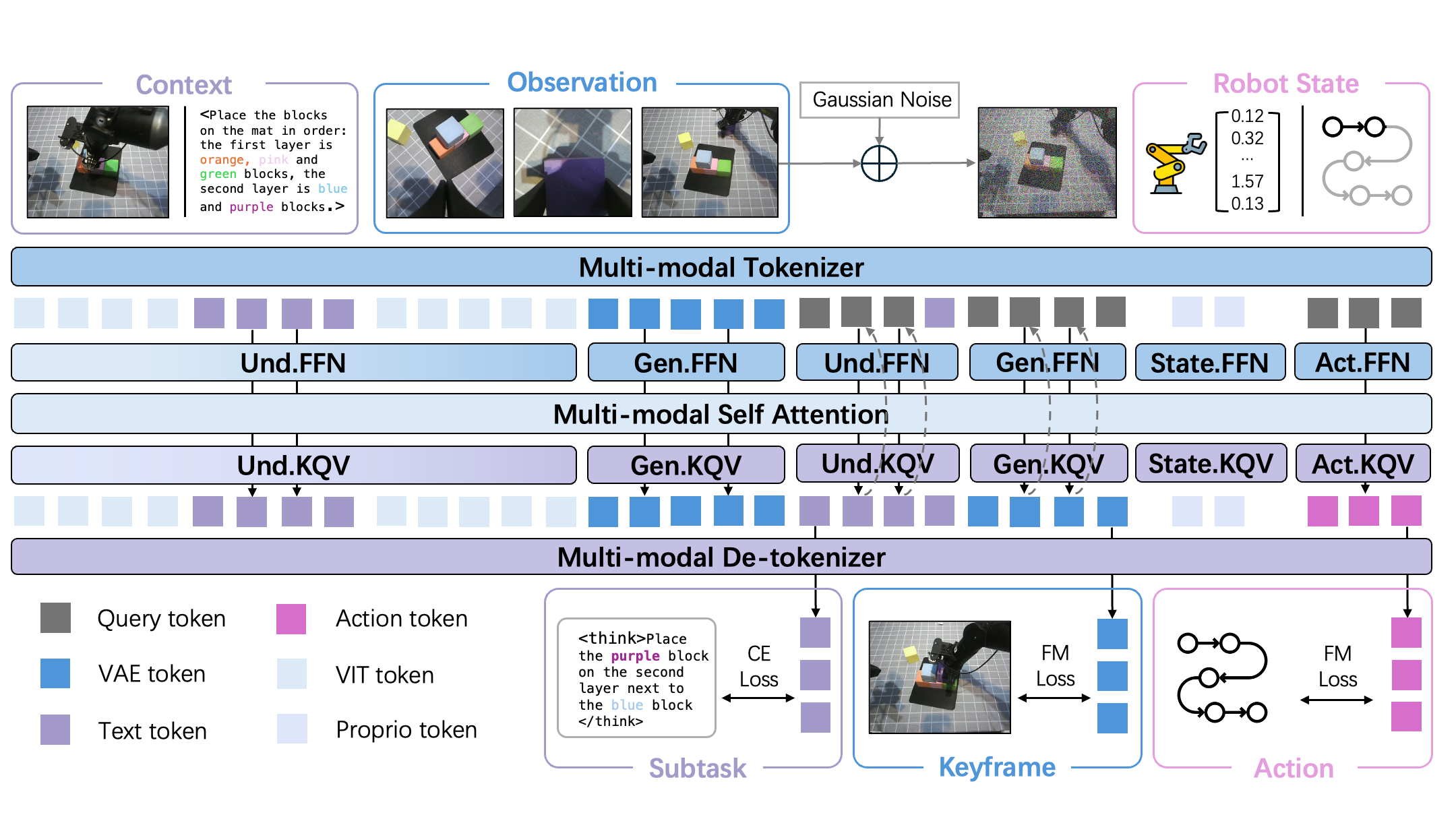 BagelVLA utilizes a Mixture-of-Transformers (MoT) architecture, comprising three independent transformers specialized for linguistic, visual, and action modalities. To tackle long-horizon tasks and semantic generalization, we formulate language-conditioned action learning as a long-sequence interleaved planning problem. These modalities are structured into a unified sequence, enabling the model to generate predictions across all three modalities based on the interleaved context.